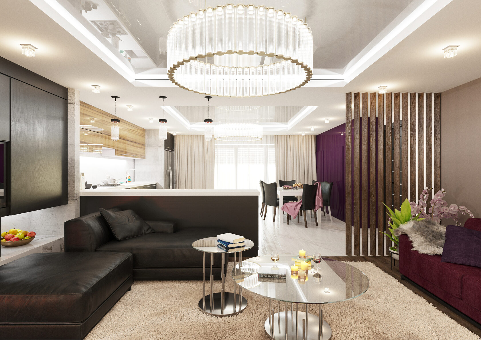 Реечная перегородка с дизайнерским расположением баффелей и интегрированной светодиодной подсветкой не только зонирует пространство, создает дополнительный сценарий освещения, но и является арт-объектом интерьера.